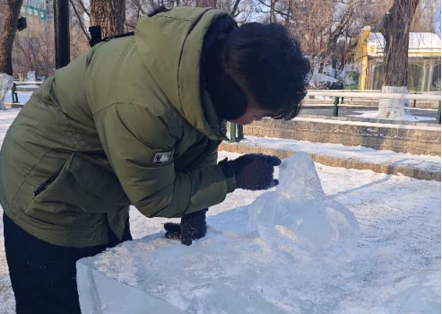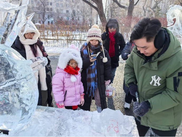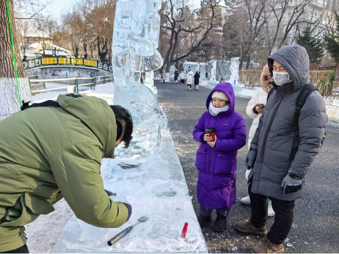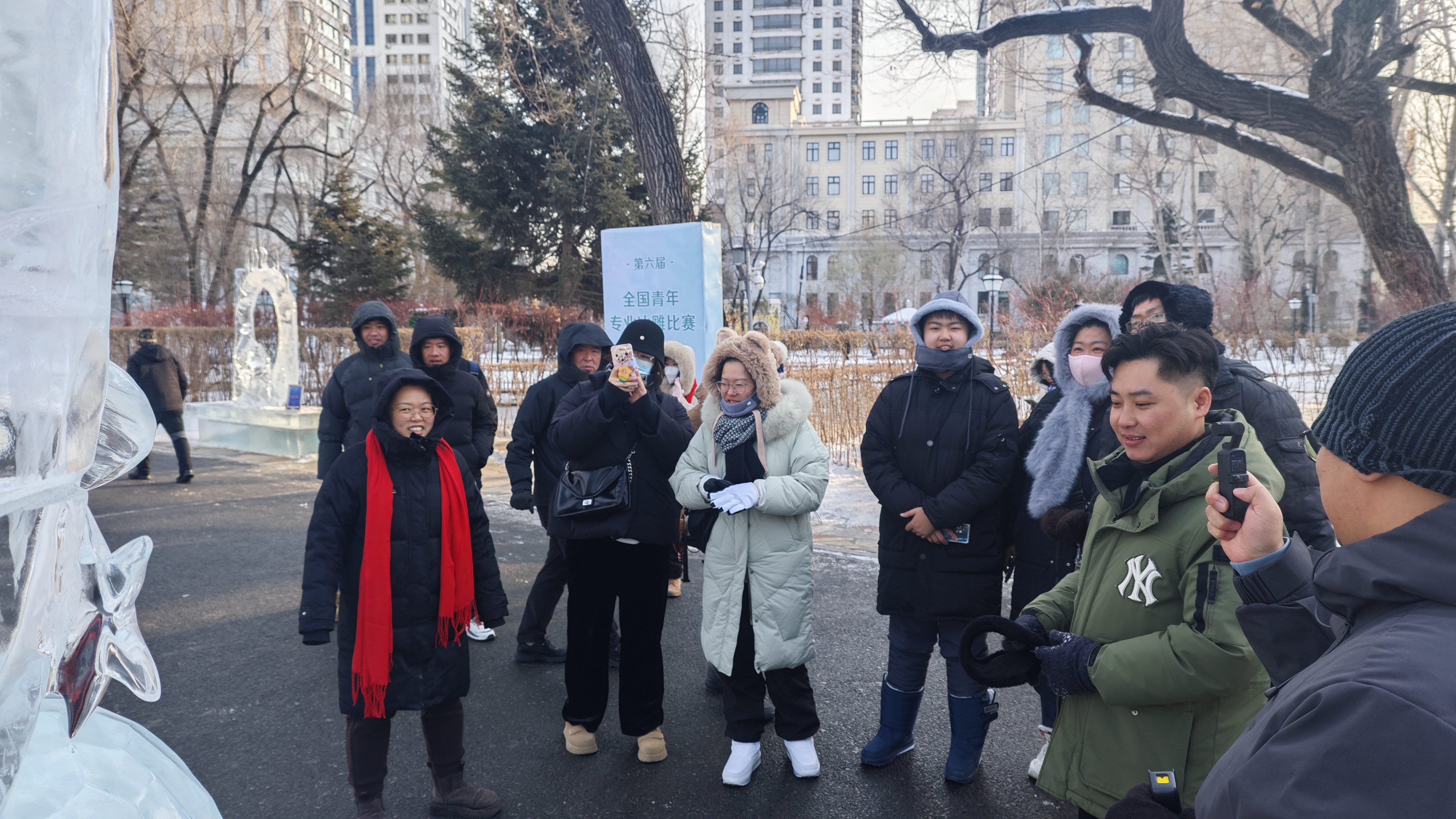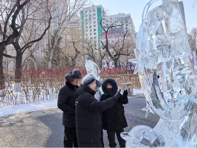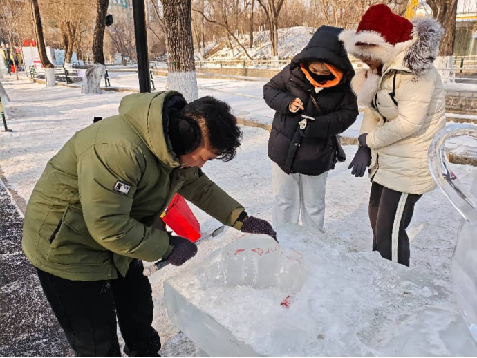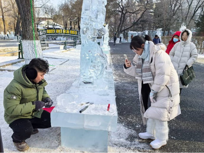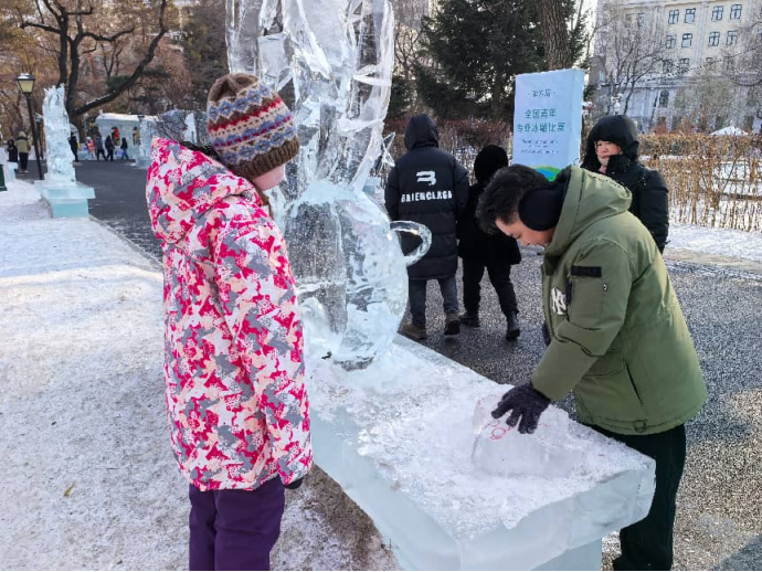 现场还设置了互动体验区,不少游客接过师生准备的简易冰雕工具,在专业教师指导下手握碎冰尝试雕刻。笑声与冰晶一同飞扬,艺术以最轻松的方式走进人群。