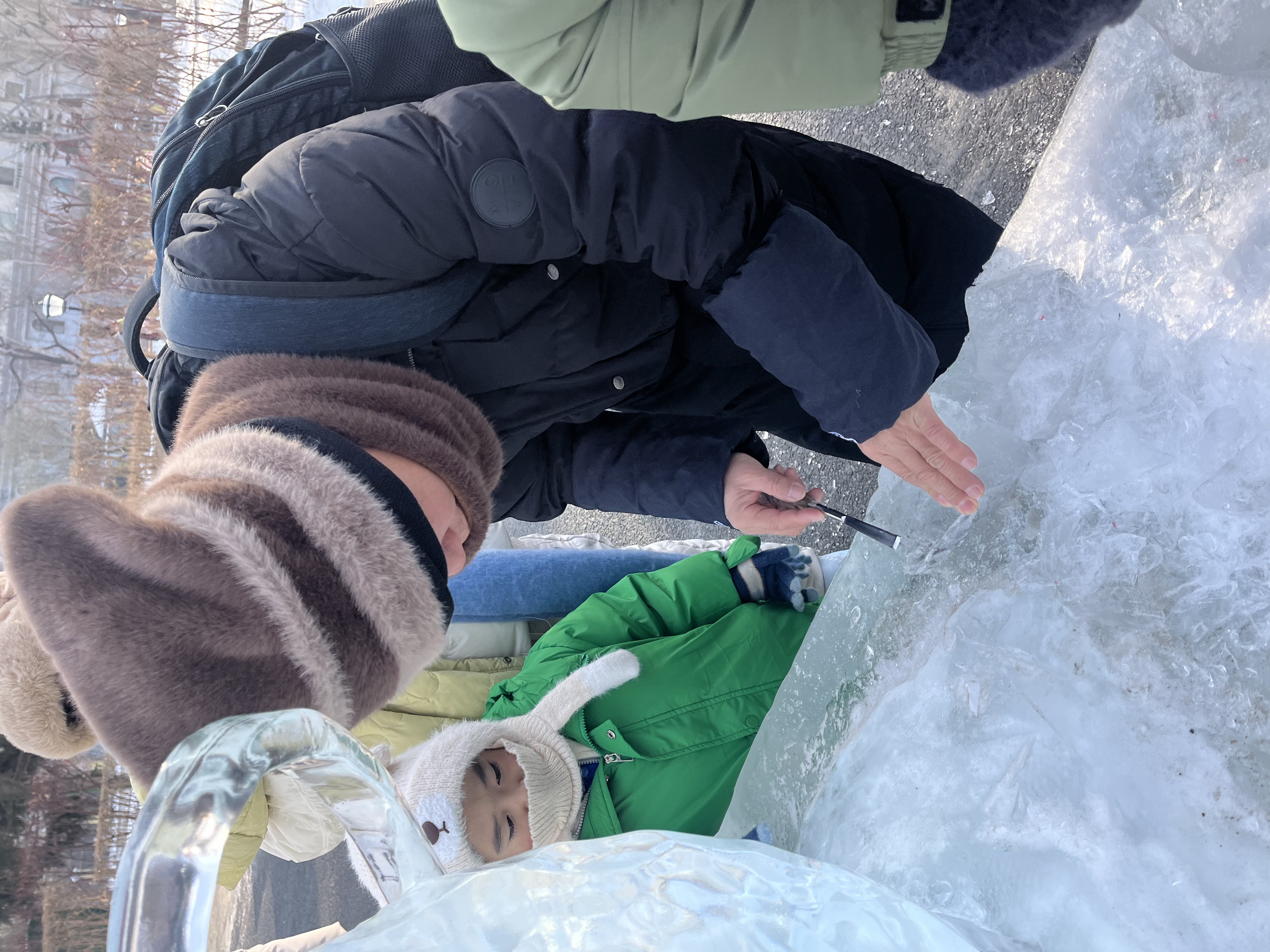 下午1点,尽管气温接近零下二十度,却挡不住艺术传播的热情。二十余名师生化身“冰雪讲师”,在金奖作品旁为来自全国各地的游客讲解冰雕的历史、技法与美学。人群中,既有来自广东、四川的南方游客好奇触摸冰面,也有辽宁、沈阳的中小学生仰头倾听冰灯起源。