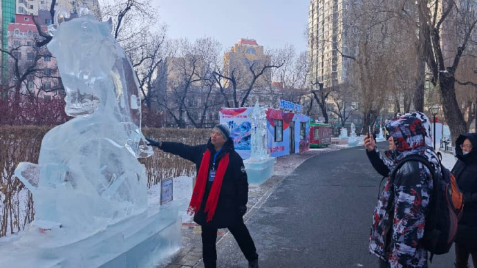 当冰雕遇见抖音热梗,会发生什么?1月28日下午,哈尔滨兆麟公园第六届“华德杯”全国专业冰雕艺术展金奖作品前,一只栩栩如生的“疯狂鸽子”冰雕突然“活”了——原来,哈尔滨华德学院艺术与传媒学院的师生们,正在这里开展一场别开生面的“冰雪艺术公开课”。