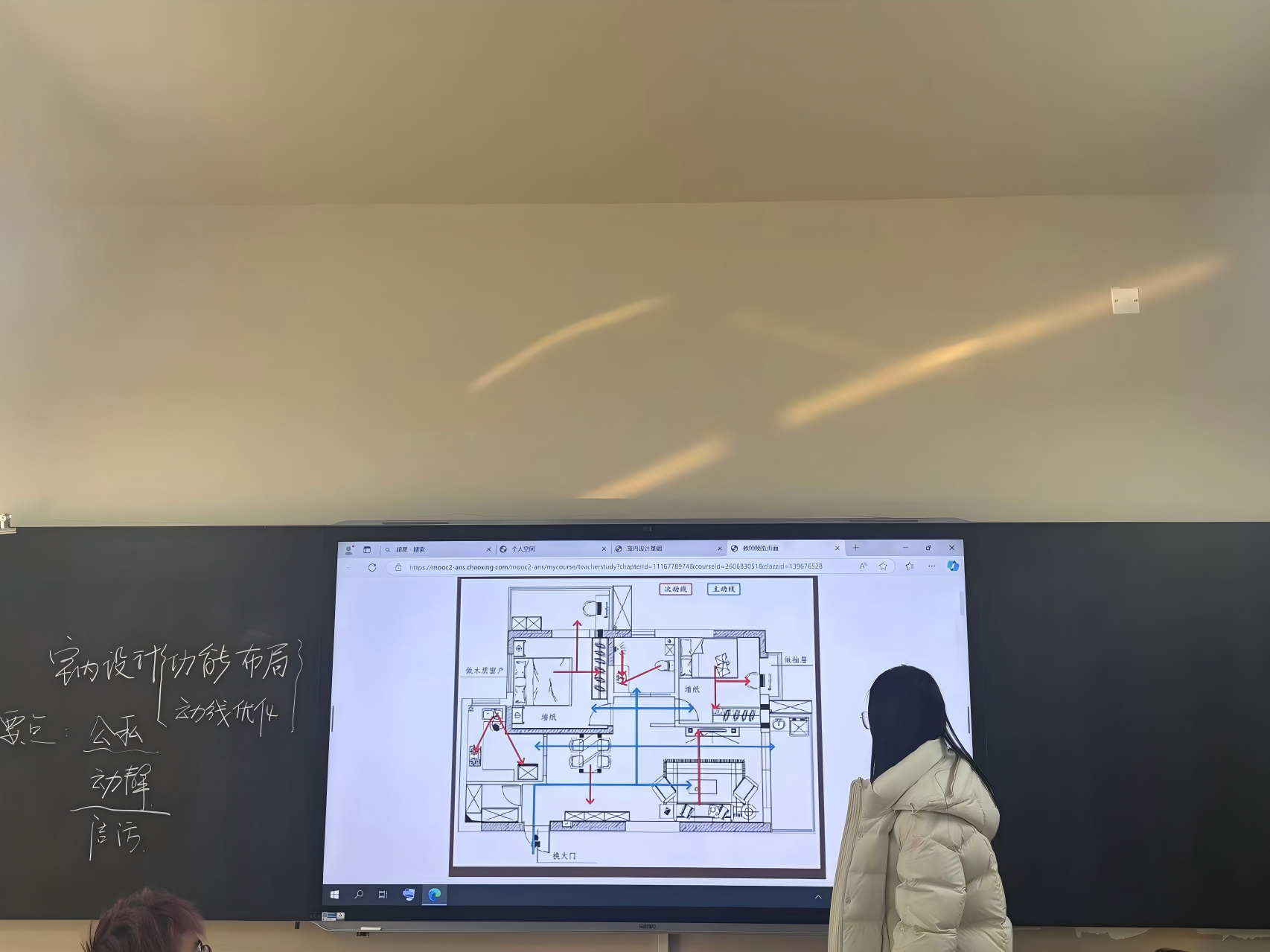 “请大家观看黑板上这张图,主卧、客厅、餐厅、阳台等室内空间,我们首先要把这些功能空间拆解为‘公共领域’和‘私密领域’。”在课程授课环节中,梁辰老师并没有直接给出标准答案,而是让学生先独立进行思考判断,引导学生对照教材中的空间分区图,自主分析不同功能空间的属性差异。