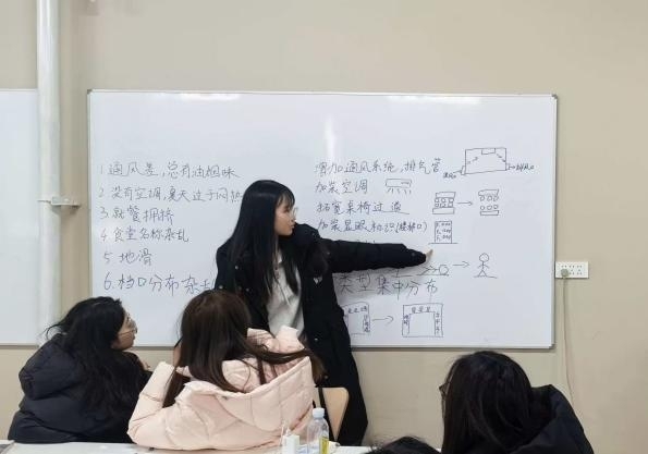 课堂中聚焦“空间行为与设计干预 ”,葛老师将学生记录的“餐厅桌椅拥挤 ”“通风不畅 ”“视觉通道狭窄 ”等转化为真实的设计项目。学生以小组为单位,结合环境心理学知识提出优化方案,有小组针对“层高较低、视觉压抑 ”的问题,提出“用浅色板材+细部线条 ”的视觉扩展策略;有小组关注“通风差、气味滞留 ”的后厨问题,建议优化气流组织与人流动线。SC 教学改革的“ 以学生为中心 ”在这一刻真正落地,学生不再是被动接受知识的聆听者,而是主动发现问题、解决问题的设计者。