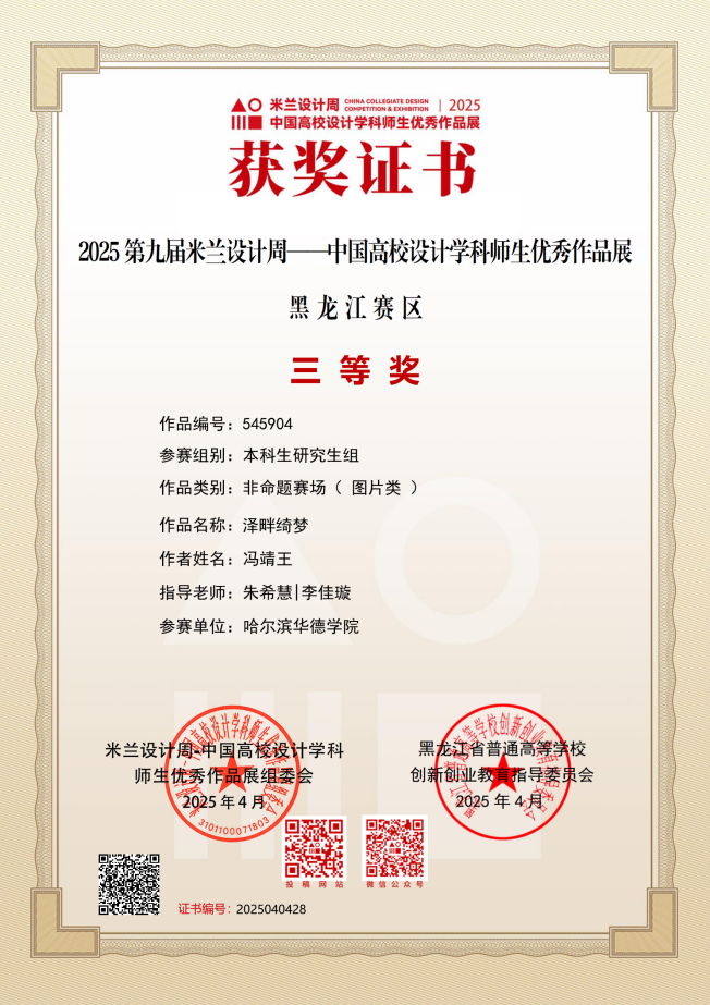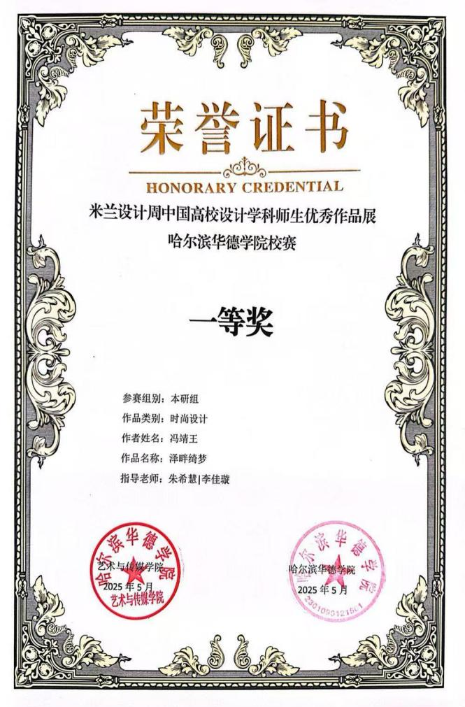 此次《服装市场营销》课程 SC 教学改革的成效,在各类教学成果展示与学科竞赛中得到充分彰显。朱希慧老师指导的学生作品在新一届高校教学成果展示活动中斩获设计类三等奖,在省级、校级学科竞赛中更是屡创佳绩,先后拿下黑龙江省第六届高校艺术类教学成果展示活动一等奖、米兰设计周中国高校设计学科师生优秀作品展黑龙江赛区三等奖及校级一、二等奖等多项荣誉。一系列竞赛成果,不仅是对学生专业能力的肯定,更印证了以学生为中心的 SC 教学新模式的显著育人实效。