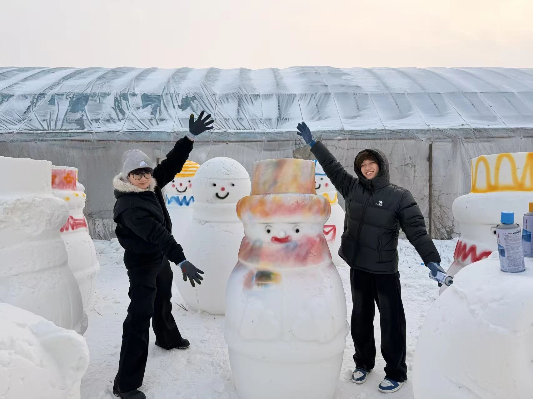 随后,学子们来到玉林村冰雪景观区,发挥艺术专业特长,为当地的雪人进行彩绘创作,大家以雪为纸、以彩为墨,通过精巧的设计和细致的描绘,让一个个雪人变得鲜活灵动,为玉林村的冰雪文旅场景增添了独特的艺术色彩。