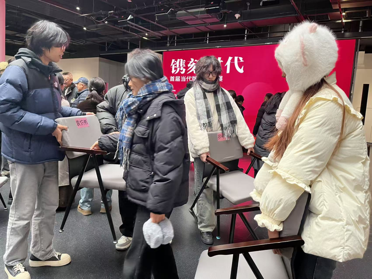 活动期间,学子们协助展馆完成布展工作,认真聆听策展人对版画作品创作背景、技法运用与思想内涵的深度解读,沉浸式观赏首届当代版画双年展“镌刻时代”的各类佳作。