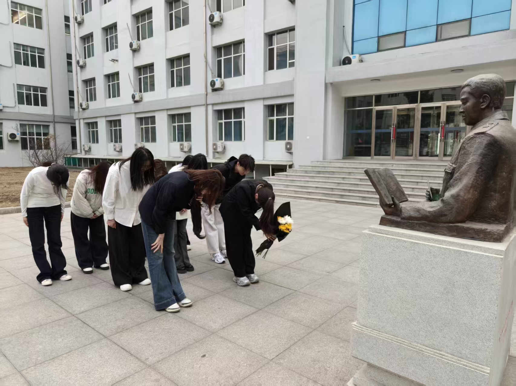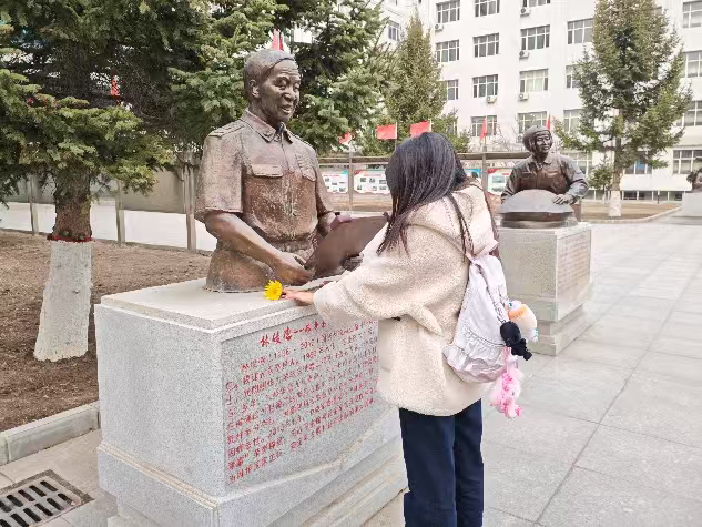在庄重肃穆的默哀仪式中,艺术学子以最敬重的仪式向革命先烈致以崇高敬意与深切哀思,在静默中追思英烈、感悟初心,接受一次深刻的红色教育,进一步坚定理想信念,强化使命担当,实地祭扫践初心,红色教育入人心。为推动红色教育走深走实,大家走出教室,前往我校“全军十大英模”塑像群开展祭扫活动。学子们手捧白菊,向烈士敬献鲜花、肃立缅怀,在沉浸式现场教育中近距离感悟英烈精神,让红色教育从课堂延伸至实践,使缅怀更真切、传承更有力,坚定青春理想,勇担时代使命。