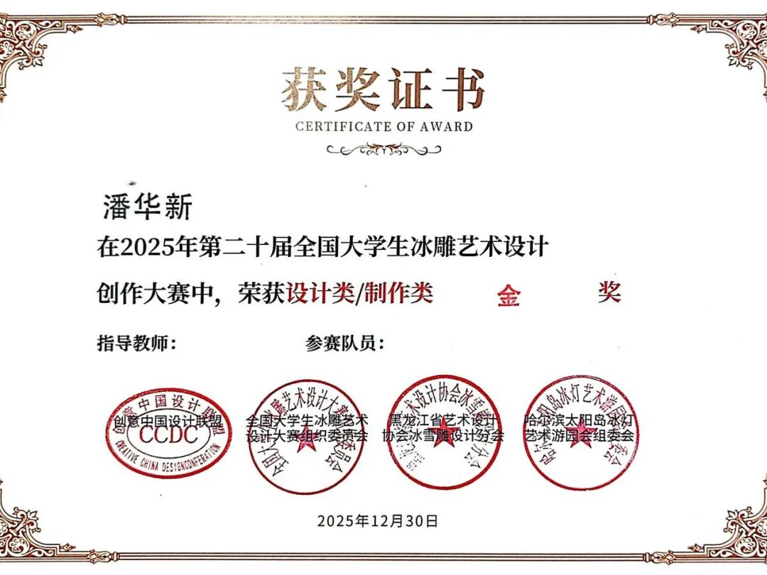 12月30日,第二十届全国大学生冰雕艺术设计创作大赛于哈尔滨兆麟公园圆满落幕。在零下二十度的严寒中,哈尔滨华德学院艺术与传媒学院师生团队凭借作品《竹月侠影》脱颖而出,勇夺设计类金奖,展现了卓越的艺术创造力与冰雪创作实力。