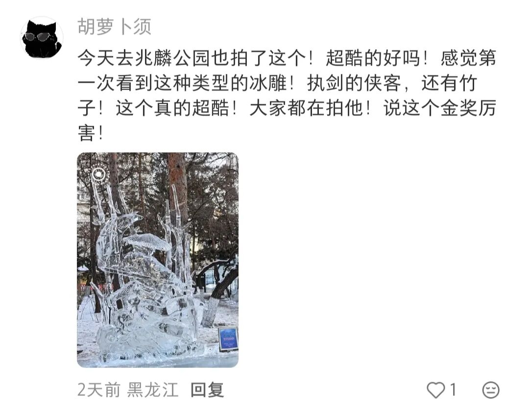作品完成后迅速引发广泛关注。《黑龙江日报》对创作团队进行了专题采访,深入报道了作品背后的创作理念与教学实践。与此同时,《竹月侠影》在抖音、微博、小红书等社交平台持续“刷屏”,成为本届赛事中兼具艺术价值与传播热度的标志性作品之一。网友纷纷赞叹“冰雕里藏着一个江湖”“金奖!实至名归”。