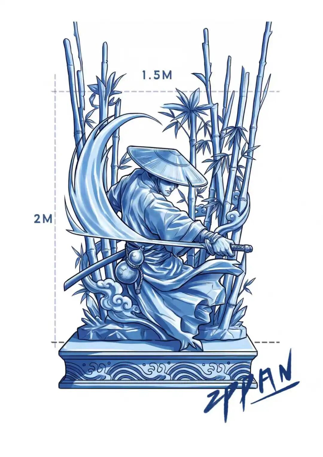 作品《竹月侠影》以“东方武侠”为创意原点,从中国古典诗词及武侠文化中提取意象,致力于在冰的材质中实现“剑影竹风、寒江独影”的意境转译。在艺术与传媒学院潘华新、庞宇两位教师的指导下,华德雪艺团队运用青蓝色调与流线型雕刻语言,塑造出斗笠侠客仗剑凝立的视觉形象,竹的劲节、剑的清寂与侠者的孤勇在冰的材质中得以诗意呈现,基座国风纹样更显沉稳厚重,整体作品实现了传统文化精神的现代表达。