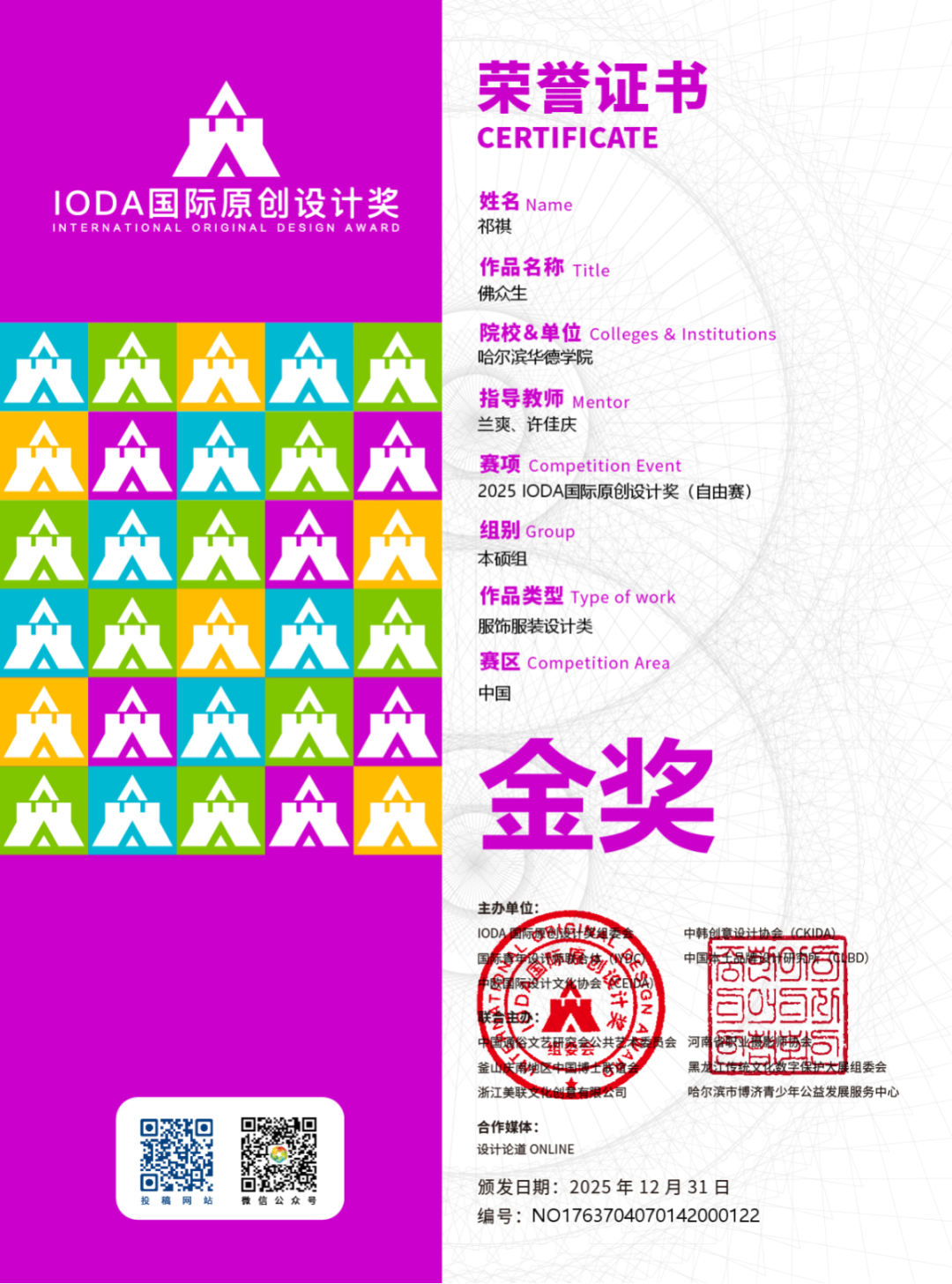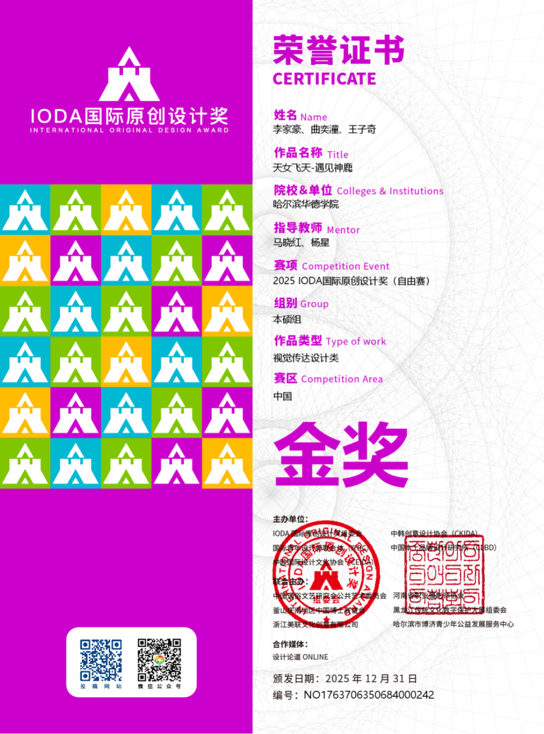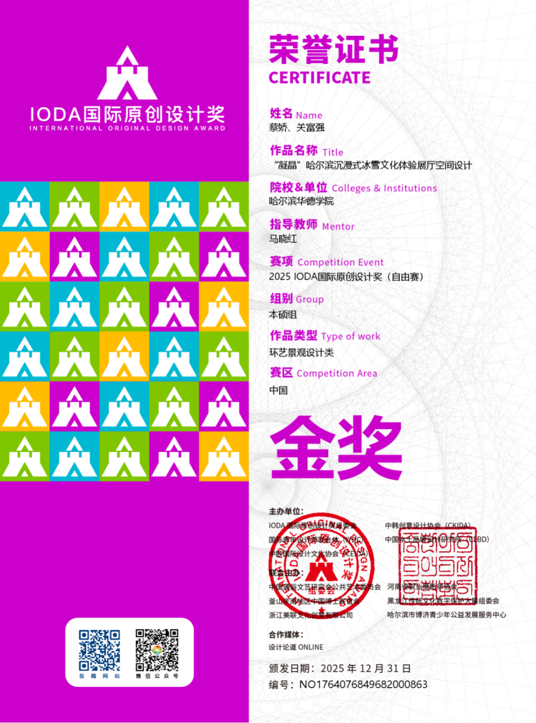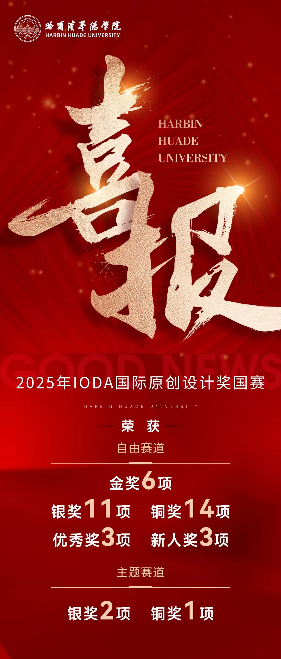 近日,2025 IODA国际原创设计奖国赛评审结果正式揭晓。哈尔滨华德学院艺术与传媒学院师生共荣获国家级奖项40项,涵盖金奖6项、银奖13项、铜奖15项及优秀奖、新人奖多项,在自由赛与主题赛等多个赛道均取得突破性成绩。这一丰硕成果,充分彰显了学校在设计教育领域的深厚积累、创新活力与国际视野。