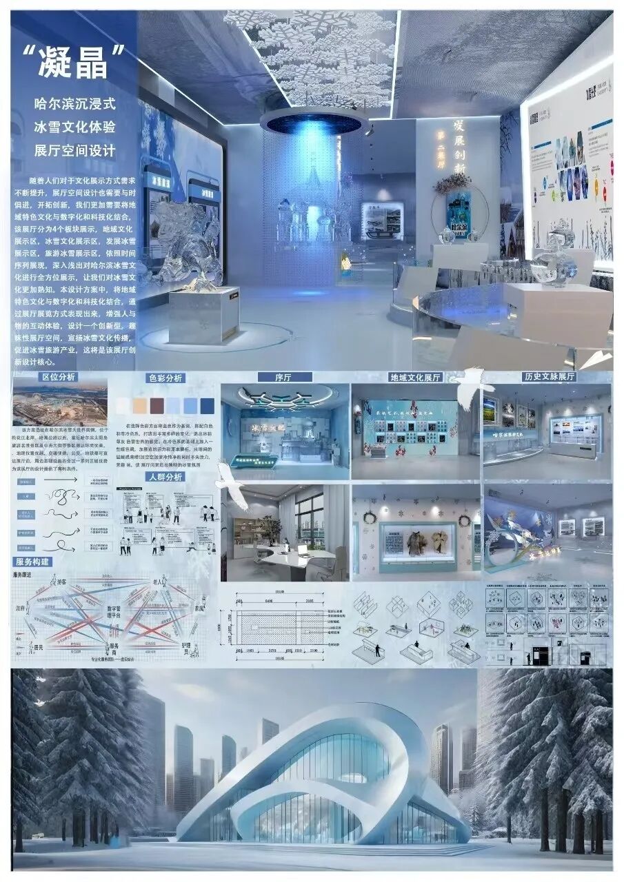 获奖学生代表蔡娇、关富强:“我们的作品《“凝晶”哈尔滨沉浸式冰雪文化体验展厅空间设计》是本次大赛环艺景观类金奖作品之一,哈尔滨的冰雪,对我而言不仅是自然馈赠,更是承载城市精神的文化。我们想构建一个能够让人‘走进冰雪记忆’的场域。‘凝晶’的创作初衷,是希望用当代设计语言,重构冰雪的形态与温度,让每一位走入展厅的人,都能感受到这座城市独有的浪漫与坚韧。”