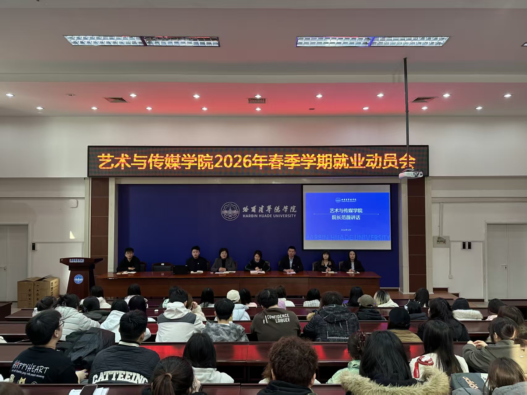 为帮助学生清晰把握就业形势,树立理性务实的就业观念,全面提升个人求职与就业竞争力。艺术与传媒学院于2026年3月12日在教一四楼会议室召开2026年春季学期就业动员会。会议由哈尔滨华德学院学生处就业创业中心李泽南主讲,艺术与传媒学院学生发展中心主任王亮主持,艺术与传媒学院院长范薇出席,各年级辅导员及学生代表参会。