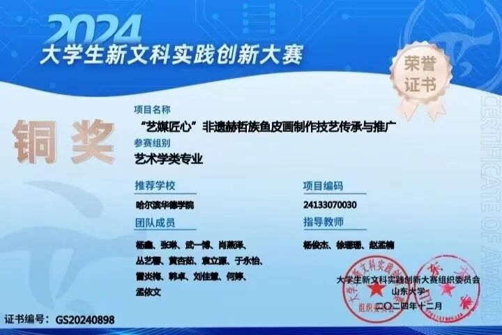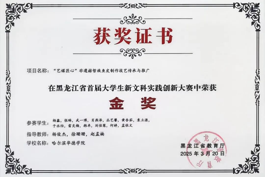 从一块朴素的鱼皮,在指尖的打磨下焕发新生,到走进社区课堂,在孩子们手中绽放惊喜;从国际舞台的文化交流,到网络世界的热烈回响——哈尔滨华德学院艺媒匠心团队的年轻人们,正在完成一场从技艺到文化的传承。当青春的创造力与古老的智慧相遇,非遗不再是博物馆里的标本,而成为流淌在时代脉搏中的活水。正如指导老师杨俊杰所言:"我们见证的不仅是技艺的传承,更是一种文化生命力的延续。"