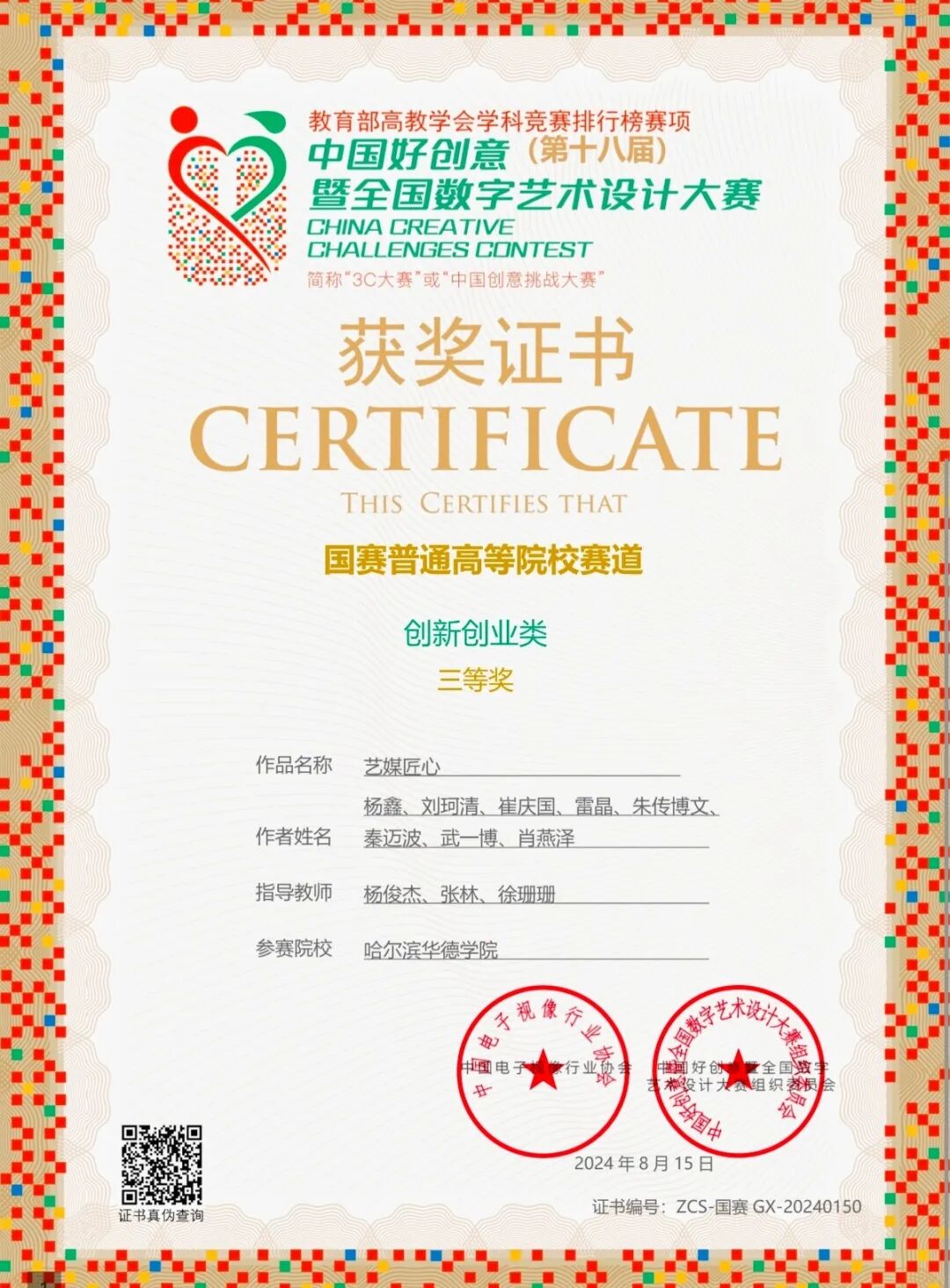 荣誉是团队成长的最佳见证。在2024年的大学生新文科实践创新大赛中,艺媒匠心的同学们一举夺得省级金奖与国家级铜奖,展现了跨学科融合的扎实成果。在“建行杯”中国国际大学生创新大赛的黑龙江省赛场上,他们不断超越自我,从2024年的铜奖跃升至2025年的银奖。同时,他们还从第十八届中国好创意暨全国数字艺术设计大赛中捧回了全国三等奖。