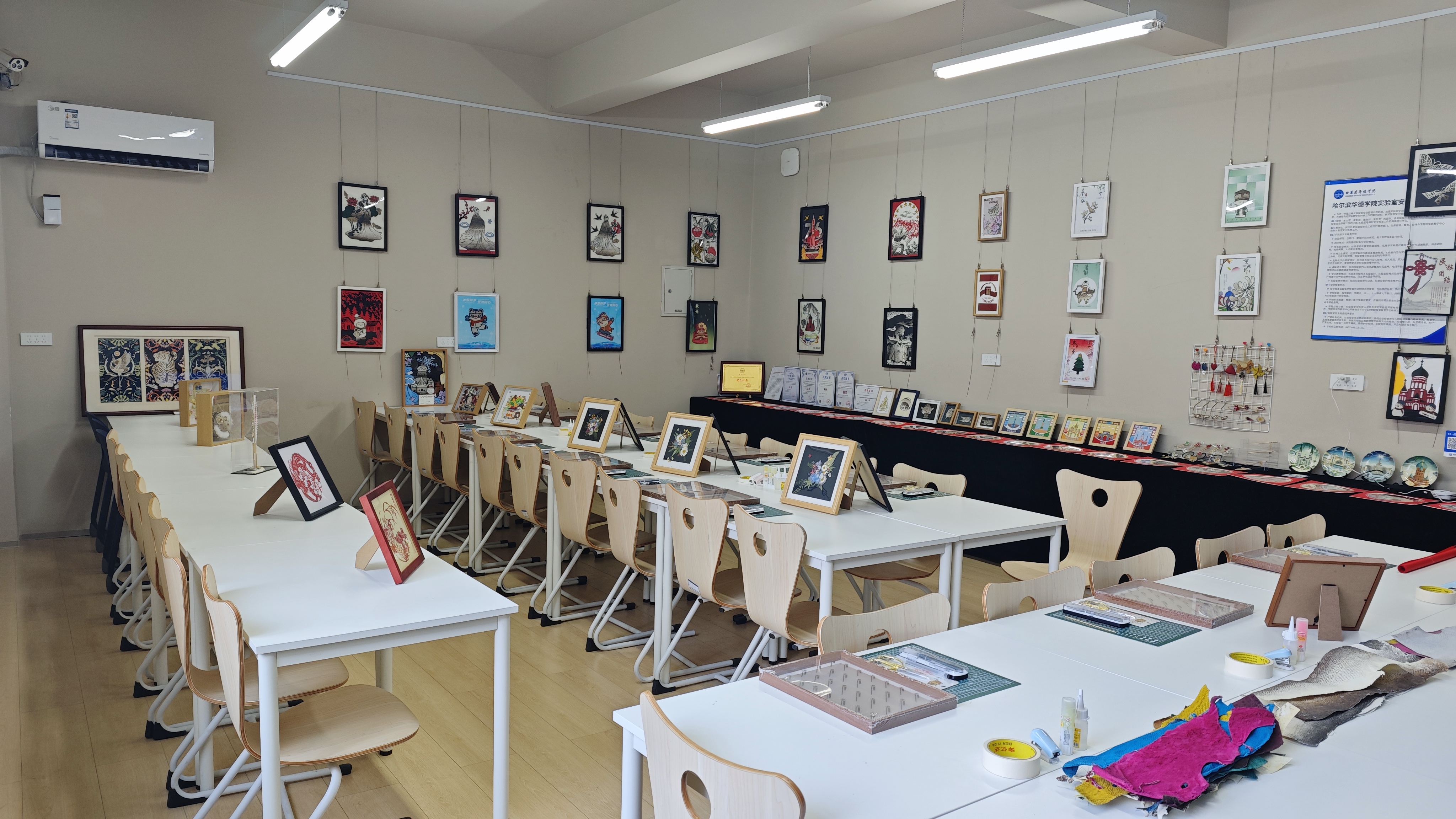 随后,研学场景切换至第二教学楼405非遗工作室。在这里,国家级非物质文化遗产赫哲族鱼皮制作技艺传承推广师生亲自讲解和指导,来访学子们从了解非遗、赫哲族渔猎文化,到亲手体验创作鱼皮画,完成了从“观看”到“创造”的深度文化体验。