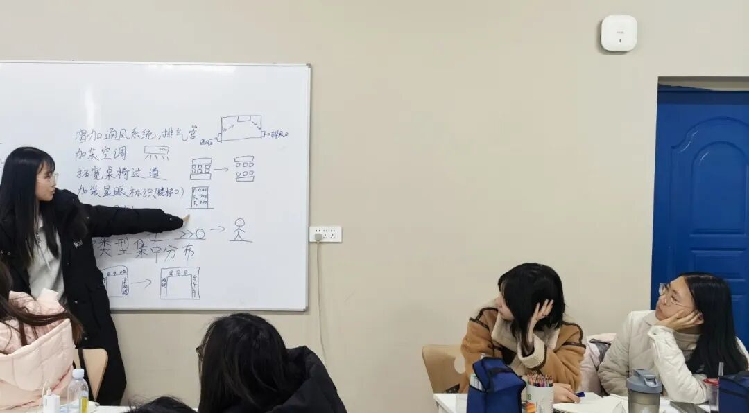 当观察转化为思考,理论便拥有了落地的力量。葛老师将学生们在调研中捕捉到的空间痛点与亮点,转化为一个个真实而具体的“微设计”课题。课堂瞬间化为充满活力的“设计工坊”。各小组结合《环境心理学》中的理论工具,针对特定空间现象,提出了充满巧思的优化方案,展现了新生代设计者的敏锐与温度:有小组关注层高空间的心理感受,提出通过材质与色彩搭配营造更开阔的视觉体验;有小组关注人流密集区域的通行效率,探讨如何通过动线优化提升空间使用舒适度;还有小组关注不同就餐形式的心理需求,思考如何通过功能分区设计满足多样化使用场景。