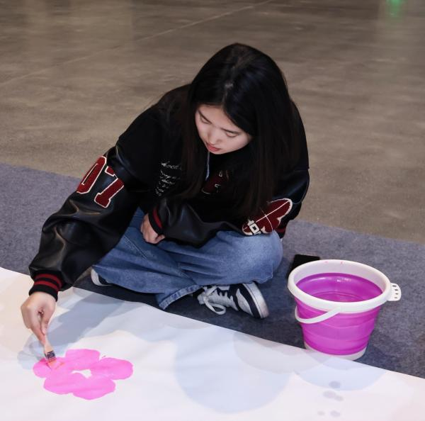 上午10时,100名华德学子在西城红场当代设计中心同框创作。学生们以高明度、高纯度的颜料,勾勒出繁花似锦、草木葱茏、鸟虫灵动的春日景象——热烈的红、明艳的黄、清透的蓝、蓬勃的绿……在画布上交织碰撞,形成一幅充满现代感的抽象花卉装饰长卷。一个小时的专注创作间,50米长的巨幅画卷从无到有、渐次绽放,引得不少市民游客驻足观赏,见证这场由百名青年共创的艺术盛宴。