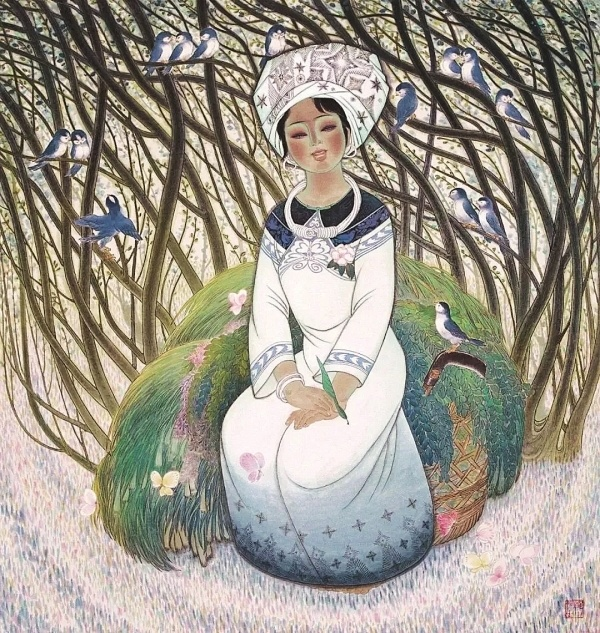 这种意境首先出现在她的《赶歌图》里,随后的《山雀》更具个性——画面主体是山的女儿和雀儿们的啼唱,却有一片可做器乐的树叶静静地捏在女孩指间,使画面在乐音缭绕间铺满宁静、恬淡与和美……郑小娟由此更加明白,营造如此气韵,离不开她对女人的执着。